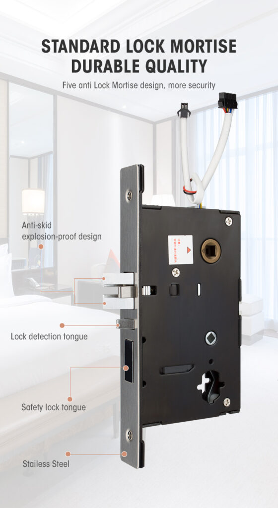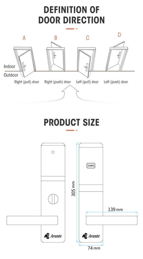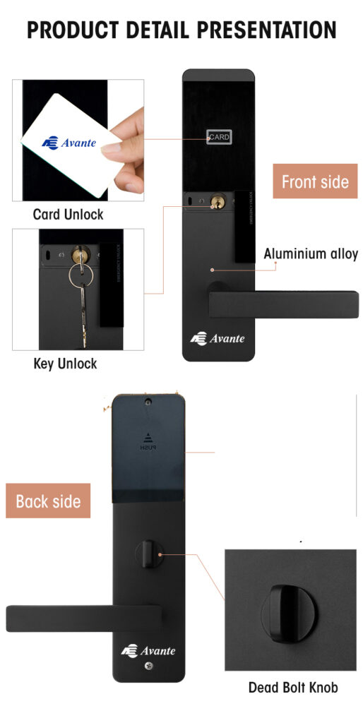 Upgrade your hotel’s security with the Avante Hotel Lock, a state-of-the-art locking system designed for modern hospitality environments. Featuring a dual unlocking system with RFID card access and a mechanical key backup, the Avante lock ensures flexibility and reliability for diverse management needs. Built with durable 304 stainless steel and a sealed PCB design, it offers enhanced protection against tampering and environmental factors. The lock also includes smart alerts and a long-lasting power supply 10–12 months, ensuring uninterrupted security for your guests.